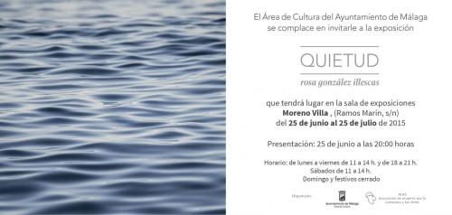 Descubro en Quietud de Rosa González Illescas una mirada nueva, un lenguaje íntimo y personal de gran impacto intuitivo. La autora que elige la fotografía como medio de expresión artística se adentra en una realidad metafórica abstrayéndose e invitándonos a la meditación contemplativa. Las imágenes cuidadosamente seleccionadas y bien ejecutadas consiguen incidir en el universo cognitivo y emocional de quienes nos aventuramos a visitarlas. Rosa González Illescas busca su propio vocabulario en cada una de sus obras fotográficas de naturaleza altamente poética. La metáfora del mar, la vida misma, seriada y cuestionada en cada instante ¿atrapa el tiempo, lo suspende en el agua como una burbuja? Es un deleite para los sentidos, un placer y una incursión a la magia que hay dentro y fuera de cada ser, lugar o cosa de este planeta nuestro.