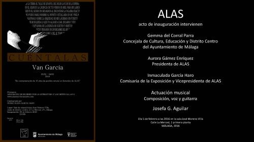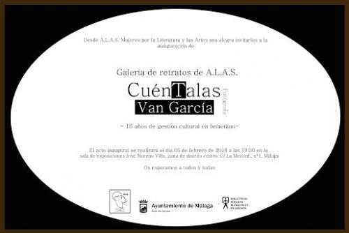 La Asociación de Mujeres por la literatura y las Artes (ALAS), de la que soy Vicepresidenta, en colaboración con la RED MUNICIPAL DE BIBLIOTECAS DE MÁLAGA celebra sus 16 años de recorrido con la exposición CUÉNTALAS -galería de retratos de la fotógrafa Van García-, además de un extenso material gráfico que reflejarán las actividades desarrolladas hasta la actualidad.