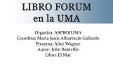 Alice Wagner Presenta LIBRO FORUM en la UMA El próximo 19 de septiembre a las 19 horas, Alice Wagner presenta "El Mar" de John Bmville dentro de la actividad de LIBRO FORUM en la UMA coordinada por María Jesús Albarracín Gallardo y organizada por ASPROJUMA. Tendrá lugar en la sala de juntas del Rectorado, planta superior. Avda. Cervantes- Paseo del Parque de Málaga (España).